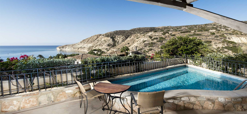 Unrivalled, panoramic views over the resort and Pissouri Bay can be enjoyed in this spacious 60 sqm suite, which are located on the small hill and opposite the resort’s west entrance. The ultimate, luxurious choice, these stunning suites feature a spacious bedroom with king bed and large seating area to enjoy the views indoors. The covered furnished verandah is the perfect place to enjoy each others company and the large marble bathroom with separate shower and luxurious toiletries ensure you feel amazing.Executive Suites Eagles Nest with Private Pool or Private Plunge Pool